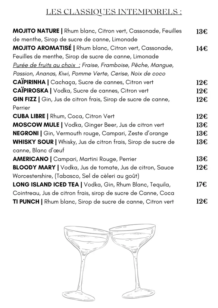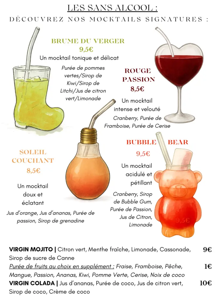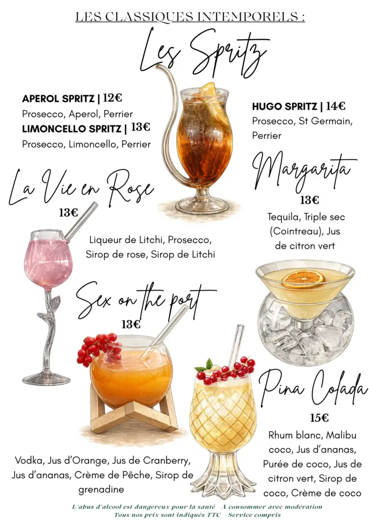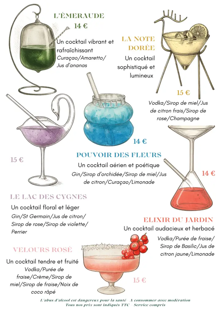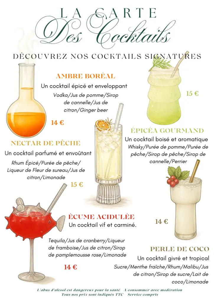Découvrez nos cocktails signature, vins de région, spiritueux premium, et boissons sans alcool maison, à savourer en terrasse ou dans notre coin lounge
